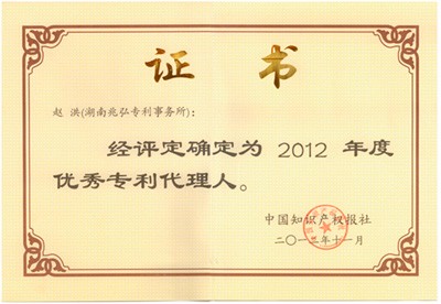 我所负责人赵洪主任也被评选为2012年优秀专利代理人 我所负责人赵洪主任也被评选为2012年优秀专利代理人 2012年11月,在2012年第六届中国专利周期间,我所负责人赵洪主任也被评选为2012年优秀专利代理人,成为全国获得2012年优秀专利代理人的30位专利代理人之一 上一条我所7件专利申请文件被评为“湖南省优秀专利申请文件” 下一条我所被中国知识产权报社评选为2012年全国优秀专利代理机构 我所谭武艺被评选为《2016年度二星专利代理人》