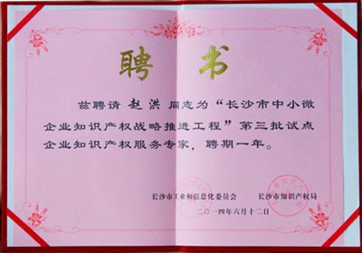 我所赵洪主任被长沙市工业和信息化委员会、长沙市知识产权局续聘为长沙市中小微企业知识产权战略推进工程试点企业知识产权服务专家 我所赵洪主任被长沙市工业和信息化委员会、长沙市知识产权局续聘为长沙市中小微企业知识产权战略推进工程试点企业知识产权服务专家 2014年6月,我所赵洪主任被长沙市工业和信息化委员会、长沙市知识产权局续聘为长沙市中小微企业知识产权战略推进工程试点企业知识产权服务专家。 上一条我所赵洪主任被中国知识产权报评选为《2014年全国二星专利代理人》 下一条我所赵洪主任被中华全国专利代理人协会评为首批专利代理行业领军人才 我所谭武艺被评选为《2016年度二星专利代理人》