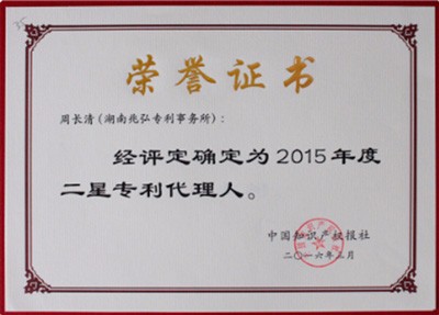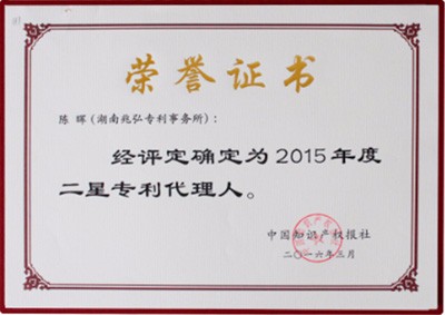 我所陈晖副主任、周长清副主任被评选为《2015年度二星专利代理人》 我所陈晖副主任、周长清副主任被评选为《2015年度二星专利代理人》 我所陈晖副主任、周长清副主任被评选为《2015年度二星专利代理人》 2016年3月,我所陈晖副主任、周长清副主任被评选为《2015年度二星专利代理人》。 上一条我所被湖南省知识产权局评为“2015年度优秀专利代理机构特色奖” 下一条我所负责人赵洪主任被评选为《2015年度三星专利代理人》 我所谭武艺被评选为《2016年度二星专利代理人》